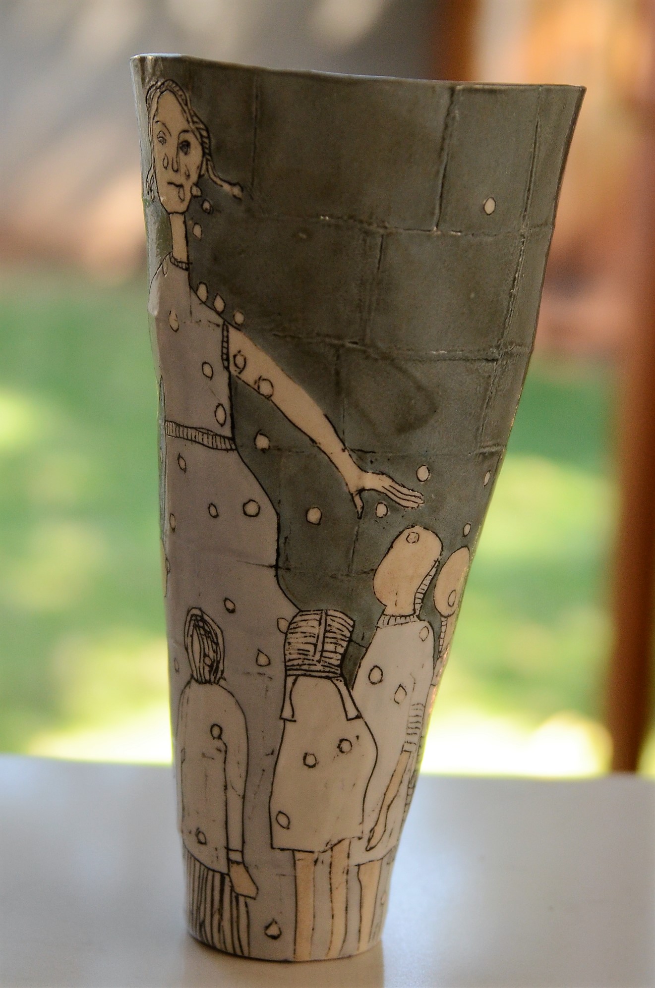 My class during the first term of 2017, was a group of 8 to 10 year olds. It was a marvelous thing to see life through their eyes. Never again, will I take not falling off a chair for granted, nor accept that my neck fits underneath my chin or that clumsy hands are a handicap. They had loads of soul and I got to know them quite well. Together we tried all sorts of things. We made little sparrow birds with our eyes closed, pinched small balls into pots, rolled clay into flat slabs, made drawings on it and then shaped the slabs into mugs and put handles on it.