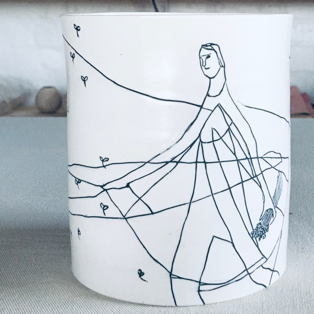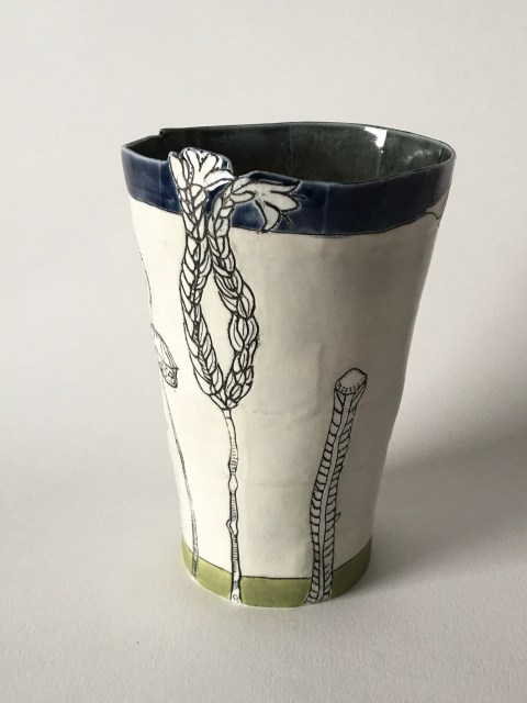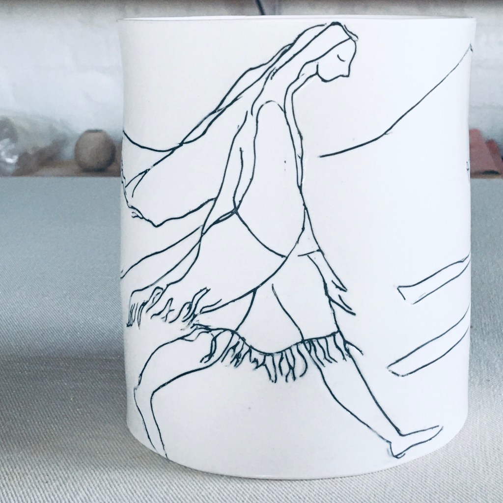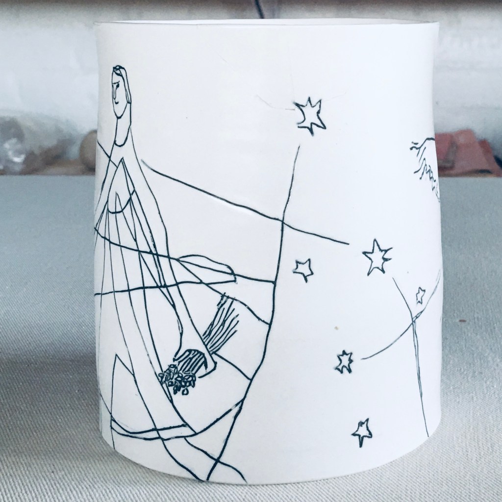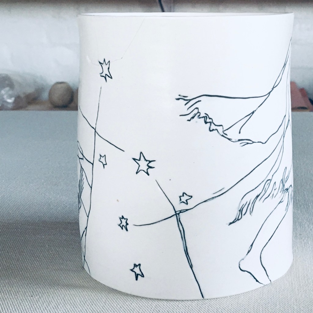 When I threw this porcelain cylinder on my wheel, calcification shone like bright stars on my mammogram and I thought at the time while peering deep into the newly formed galaxy bursting into my life that it was the most beautiful night sky I had ever seen. And then all my dreams and hopes tumbled like heavy stones in my mind until I received the news of a benign outcome.