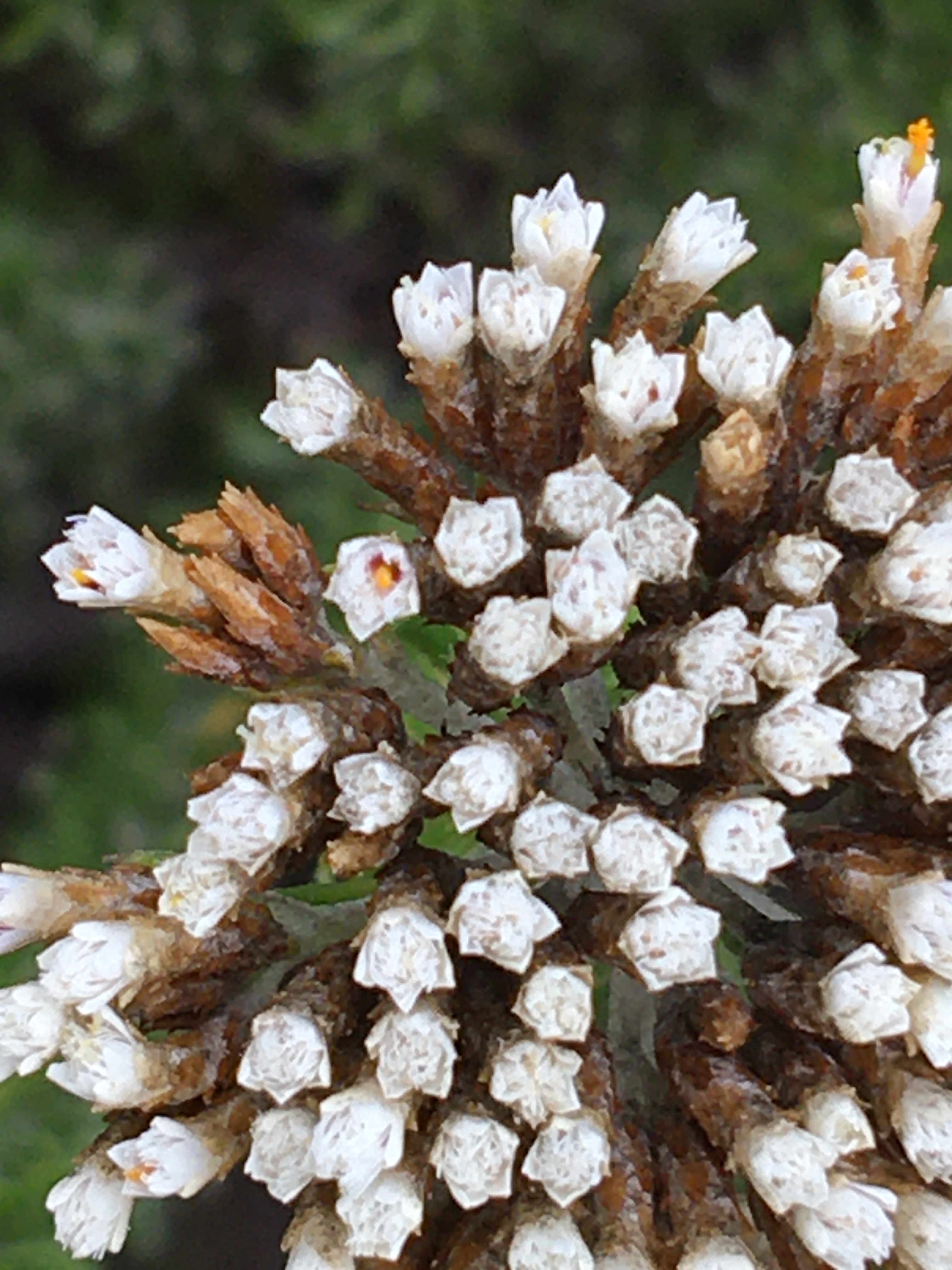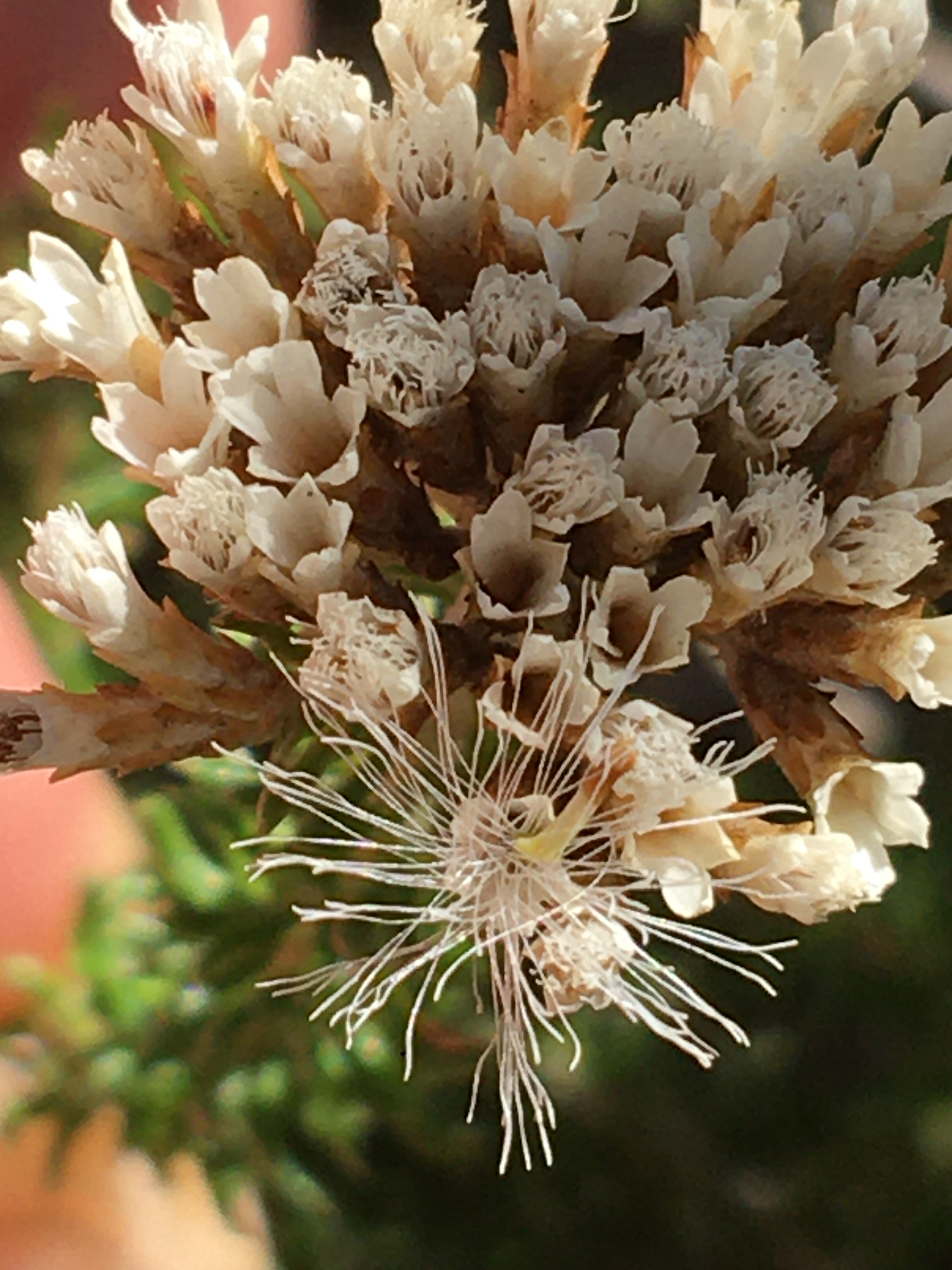 Further back behind the first dune, Metalasia muricata grows. It forms smaller rounder bushes of upto 1.5m tall. Its leaves are more twisty and flower heads more dense. The florets sit inside brown papery bracts. Before the first cold, the bracts pop open and small florets show their faces. I was surprised that these actually bear fruit. Attached to each fruit long bristles known as the pappus grows. This pappus flies the seed on the currents of the wind.